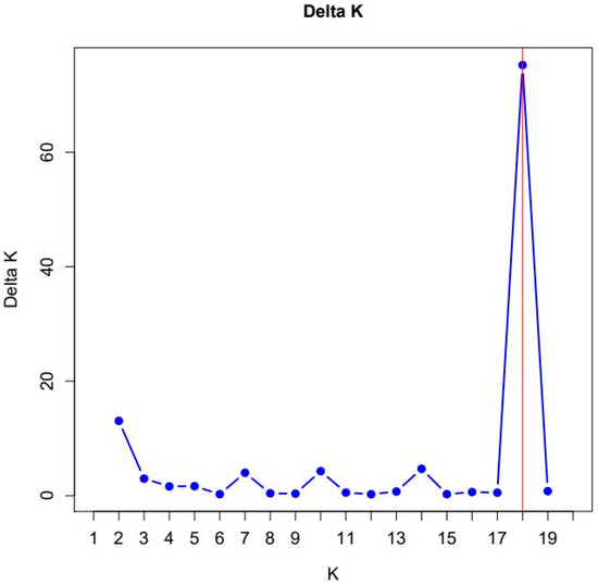 Plot of ΔK (Delta K) values from 10 independent STRUCTURE runs for K = 2–19. The maximum value is indicated by a red vertical line.