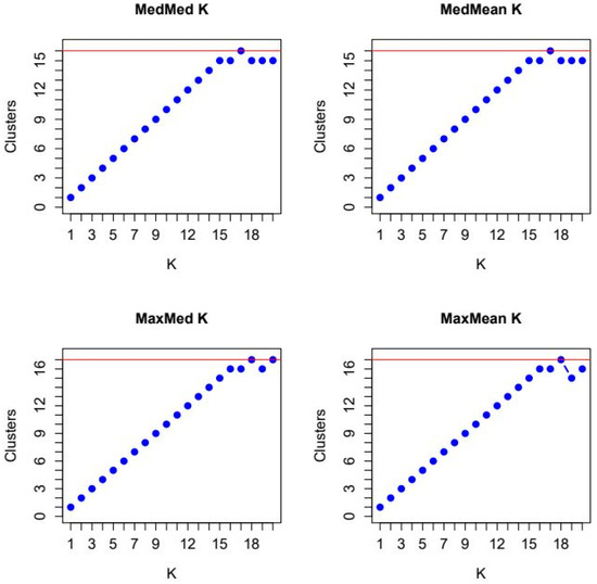 Plots of the medians (Med) and means (Mean) of the median (Med) and maximum (Max) number of inferred proportions of memberships to clusters with a threshold of 0.7. The red line indicates the maximum values reached by the MEDMEDK, MEDMEAK, MAXMEDK and MAXMEAK statistics.