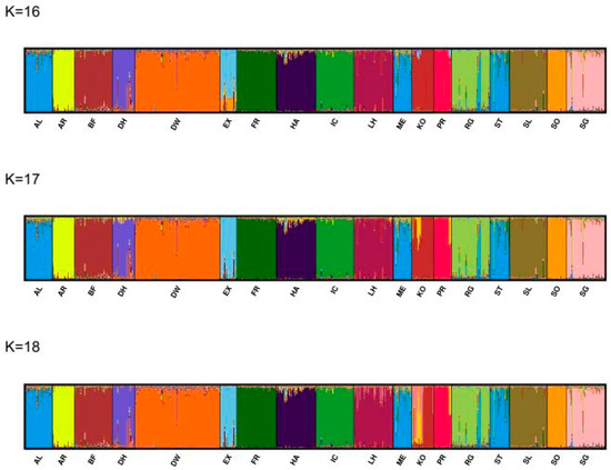 We displayed the major modes from the post-processed population structure results for K = 16–18 in Figure 7 and for K = 2–18 in Supplementary Materials Figure S6 based on CLUMPAK [34,37].