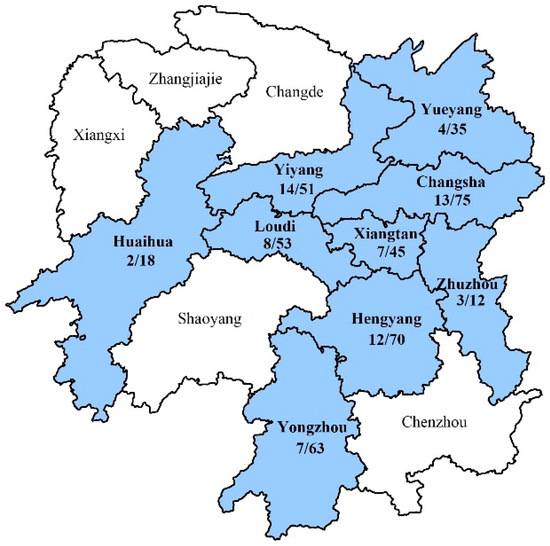 Geographical distribution of PPV7 in Hunan Province. Blue regions represent locations of swine with samples that were positive for PPV7.