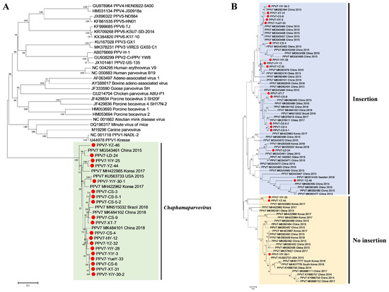 Phylogenetic trees of the Parvovirinae subfamily and PPV7 strains. The phylogenetic trees were reconstructed based on Cap amino acid sequences using p-distance-based neighbor-joining (NJ) method (A) and using the Maximum-likelihood (ML) method (B) with Jones-Taylor-Thornton (JTT) model of MEGA 7.0 with 1000 bootstrap replicates, respectively. Red solid circles indicate the strains obtained in this study.
