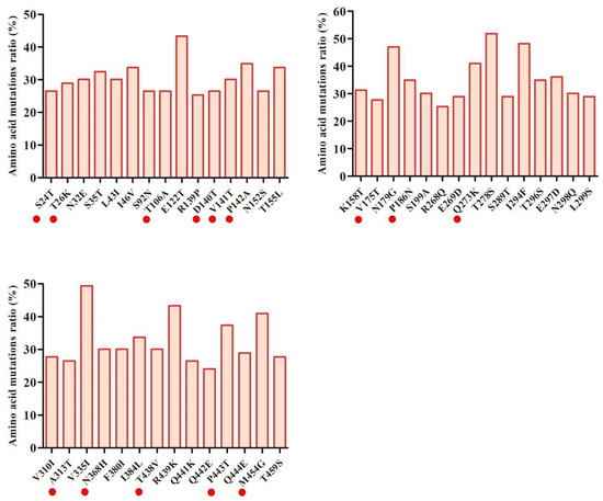 Ratio of high-frequency amino acid mutations in the Cap protein of all PPV7 isolates. Red solid circles indicate ratio of high-frequency amino acid mutations in Cap protein in our PPV7 isolates obtained in this study.