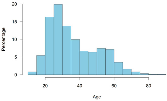 The distribution of age groups among participants is shown in Figure 1 (ntotal = 3246). Participants were between 10 years and 88 years old. Most participants were aged between 25 and 30 years (19.9%), followed by those between 20 and 25 years (16.3%) and those between 30 and 35 years (13.7%). Participants were mainly female (86.5%) (ntotal = 3195).