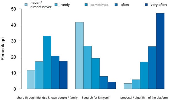 Percentage of how often participants viewed animal videos on social media platforms via sharing, searching, or proposal by the platform’s algorithm (ntotal = 2982, 2983, 2977).