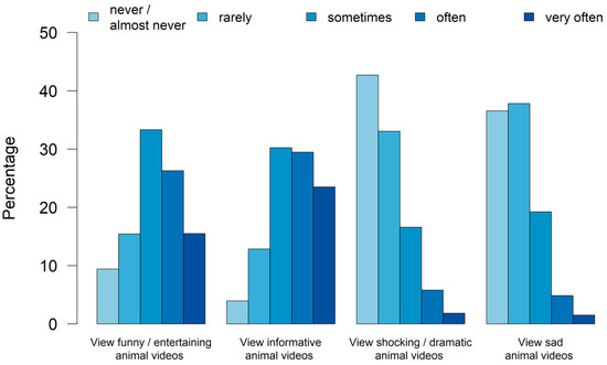 The most frequently viewed animal videos were informative ones, while funny/entertaining ones ranked second (Figure 3). A total of 41.8% viewed funny/entertaining animal videos often/very often, while informative videos were seen often/very often by 52.9% of participants (ntotal = 2984).