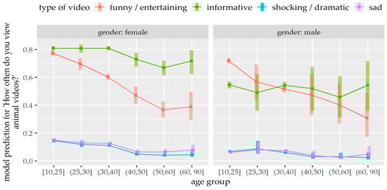 Additionally, there was an effect of the interaction between gender and age group on watching different types of animal videos (p < 0.001) (Table 2 and Figure 4). Female participants of all age groups were more likely to view informative videos than funny/entertaining videos (age group 10–25 years: p = 0.001, other age groups: p < 0.001), while there was no significant difference between informative and funny/entertaining videos for male participants of almost all age groups (p > 0.05), except for younger males between 10 and 25 years who were more likely to view funny/entertaining videos than informative ones (p < 0.001) (Figure 4 and Table S3). Furthermore, female participants of all age groups, except the age group 60–90 years (p > 0.05), were more likely to view informative videos than male participants (age groups 10–25, 25–30, 30–40 years: p < 0.001, age group 50–60 years: p = 0.008) (Figure 4 and Table S3).