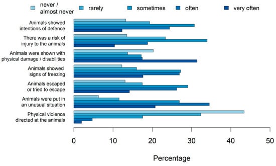 Figure 5 shows which video content the participants saw that revealed animal suffering to them. Participants saw animal suffering-related content most (highest percentage on very often/often) when animals were put in an unusual situation and least (highest percentage on never/almost never) when there was physical violence directed to the animals.