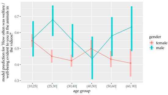 Additionally, there was an effect of the interaction between gender and age group on the recognition of animal well-being (p = 0.002) (Table 7 and Figure 6). Male participants of most age groups were more likely to recognise animal well-being in videos than female participants (25–30 years: p < 0.001, 30–40 years: p = 0.024, 50–60 years: p = 0.035, 60–90: p = 0.011). There was no significant difference between male and female of age groups 10–25 years and 40–50 years (p > 0.05).