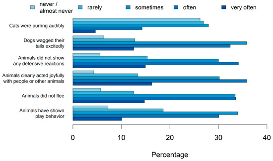 Figure 7 shows which video content the participants saw that revealed animal well-being to them. Participants saw animal well-being most (highest percentage on very often/often) when animals clearly acted joyfully with people or other animals and least (highest percentage on never/almost never) when cats were purring audibly.