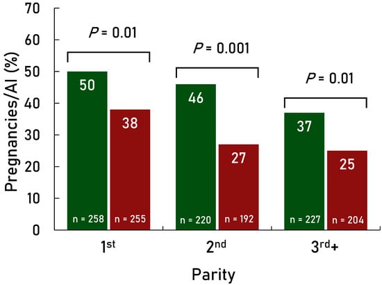 Embryonic development of multiparous dairy cows receiving AI following a detected estrus was significantly reduced when compared with nulliparous heifers [1]. This landmark paper prompted significant research to improve pregnancies/AI (P/AI) in multiparous dairy cows [2,3,4]. Currently, synchronization programs that improve the fertility of lactating dairy cows are referred to as ‘fertility programs’, such as Double Ovsynch and G6G [3,5], which pre-synchronize cows to approximately d 5 to 8 of the estrous cycle for the initiation of Ovsynch [6], or Presynch/Ovsynch [7,8], which is dependent upon estrus following each PG to control the time of the estrous cycle at the start of Ovsynch. The first-wave dominant follicle between day 5 and 8 of the estrous cycle has approximately an 85 to 92% chance [5,9] of ovulating following the first GnRH-induced LH surge of Ovsynch and, if so, will initiate a new CL and follicular wave in most cows. This new follicular wave controls the antral age of the ovulatory follicle compared with cows observed in standing estrus. Sartori et al. (2001) [10] demonstrated greater P/AI in cows that ovulated with the first GnRH compared with cows that did not ovulate. Cows that were in the first 4 d of the new follicular wave did not respond to the first GnRH-induced LH surge and ovulate, thus ovulating a follicle with a greater antral age at the final GnRH of Ovsynch [10]. New accessory CL created following GnRH increased the percentage of cows with >2 ng/mL P4, at the time of PGF2α, by 50% [11]. This may be beneficial to oocyte maturation via a reduction in pulses of LH and FSH during the growth of the ovulatory follicle prior to induced luteolysis. The timing of AI may also benefit fertility programs due to the reduction in variability in cows receiving AI 16 h post LH surges [12]. This allows sufficient time for proper capacitation of sperm prior to or at the time of ovulation. This combination of controlling the antral age of the ovulatory follicle, increased P4 during follicle development, and timing of AI relative to ovulation appears to benefit the fertility of lactating dairy cows [3].