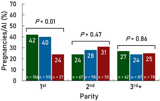 Effect of timed AI only with the fertility program Presynch-11/Ovsynch (Presynch-11; green bars) vs. AI following detected estrus following both PGF2α injections within Presynch-11/Ovsynch with timed AI (TAI) utilized in cows not detected in estrus (Estrus + TAI; maroon bars) on P/AI in first, second, and third + parity lactating dairy cows. Approximately 24% of the Estrus + TAI group were not observed in standing estrus between 60 and 91 DIM and received TAI.