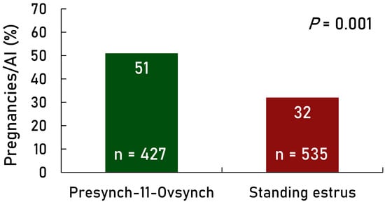 The reason for low P/AI in this group may be attributed to how Presynch-11 controls ovarian development. Unfortunately, follicular dynamics were not measured and compared between the two treatments in this study. Potential differences reported in the literature could include the antral age of the ovulatory follicle, the diameter of the ovulatory follicle, the % with double ovulations, and circulating P4 concentrations during the growth of the ovulatory follicle [25,26,27].