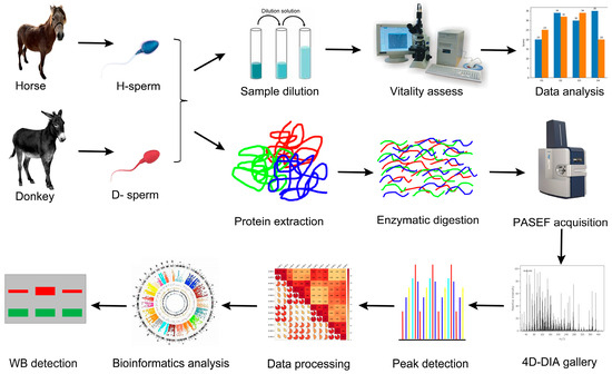 Sperm samples from horses and donkeys were collected separately. A portion of the samples was diluted for sperm viability testing, while another portion underwent protein extraction, enzymatic digestion, PASEF collection, a 4D-DIA library search, peak detection, data processing, and bioinformatics analysis. Subsequently, Western blotting experiments were conducted to validate the expression of key proteins in horse and donkey sperm. The experimental design and workflow are illustrated in Figure 1.