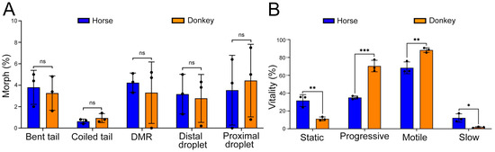Evaluation of horse and donkey sperm morphology and vitality. (A) CASA features of morphological parameters in horse and donkey sperm. (B) CASA features of vitality parameters in horse and donkey sperm. No significant difference is indicated by ns (p > 0.05), a single asterisk (*) indicates a statistical difference at p < 0.05, a double asterisk (**) indicates a significant statistical difference at p < 0.01, and three asterisks (***) indicates an extremely significant statistical difference at p < 0.001.