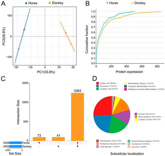 Display of the horse and donkey sperm proteomes. (A) PCA of the horse and donkey sperm proteomes. (B) CDC of the horse and donkey sperm proteomes. (C) UpSet plot of the horse and donkey sperm proteomes. (D) Subcellular localization of the horse and donkey sperm proteomes.