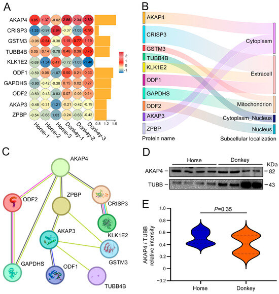To characterize the properties of horse and donkey sperm proteins, we conducted a comprehensive analysis of the sperm proteome sequencing data from these two species, identifying those that are co-expressed proteins (CEPs) in both horse and donkey sperm. We found that the top 10 proteins with the highest expression levels were the same in both horse and donkey sperm, namely, proteins AKAP4, CRISP3, GSTM3, TUBB4B, KLKIE2, ODF1, GAPDHS, ODF2, AKAP3, and ZPBP. Furthermore, the expression levels of the donkey sperm proteins in this top 10 list were notably greater than those of the horse sperm proteins, with the exception of the CRISP3 and KLK1E2 proteins (Figure 4A). Among them, AKAP4, AKAP3, and ZPBP are localized in the cytoplasm, while CRISP3, KLK1E2, and ODF1 are extracellular. GAPDHS and GSTM3 predominantly reside in the mitochondria, ODF2 is located in the nucleus, and TUBB4B is localized in both the nucleus and cytoplasm (Figure 4B). We observed interactions among all of the top 10 proteins, with AKAP4 showing connections with the majority of the other proteins (Figure 4C). This finding suggested that AKAP4 may be a pivotal protein. Furthermore, considering previous reports linking AKAP4 protein to sperm viability and fertility in other species, we employed Western blotting to assess the expression of AKAP4 protein in horse and donkey sperm. AKAP4 protein was highly expressed in both horse and donkey sperm, but the difference was not significant (p > 0.05) (Figure 4D,E). The aforementioned evidence indicates that, while the majority of proteins in horse and donkey sperm are shared, there may be differences in their expression trends, potentially accounting for the difference in sperm viability between these two species.