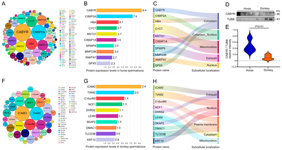 Classification of horse and donkey sperm SEPs. (A) A total of 73 SEPs in horse sperm, with the different-sized circles representing the expression levels of proteins. (B) The expression levels of the top 10 SEPs in horse sperm. (C) Subcellular localization of the top 10 SEPs in horse sperm. (D) CABYR protein expression in horse sperm. (E) The quantified relative intensity of CABYR/TUBB. (F) A total of 41 SEPs in donkey sperm, with the different-sized circles representing the expression levels of proteins. (G) The expression levels of the top 10 SEPs in donkey sperm. (H) Subcellular localization of the top 10 SEPs in donkey sperm. TUBB protein expression was used as an internal control. The data are expressed as the means ± SDs. p < 0.05 was considered to indicate a statistically significant difference.