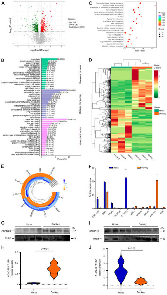 Comparison of DEPs between horse and donkey sperm. (A) Volcano plot of horse and donkey sperm DEPs, with upregulated and downregulated proteins represented by green and red dots, respectively. (B) GO enrichment analysis of the DEPs in horse and donkey sperm. (C) KEGG pathways of the DEPs in horse and donkey sperm. (D) Heatmap of all DEPs involved in the top 10 signaling pathways in horse and donkey sperm. (E) Circle diagram of the top 10 DEPs in horse and donkey sperm. (F) The expression of the top 10 DEPs in horse and donkey sperm. (G) ACADSB protein expression in horse and donkey sperm. (H) The quantified relative intensity of ACADSB/TuBB. (I) S100A12 protein expression in horse and donkey sperm. (J) Quantification of the relative intensity of S100A12/TuBB. TUBB protein expression was used as an internal control. The data are expressed as the means ± SDs. p < 0.05 was considered to indicate a statistically significant difference.