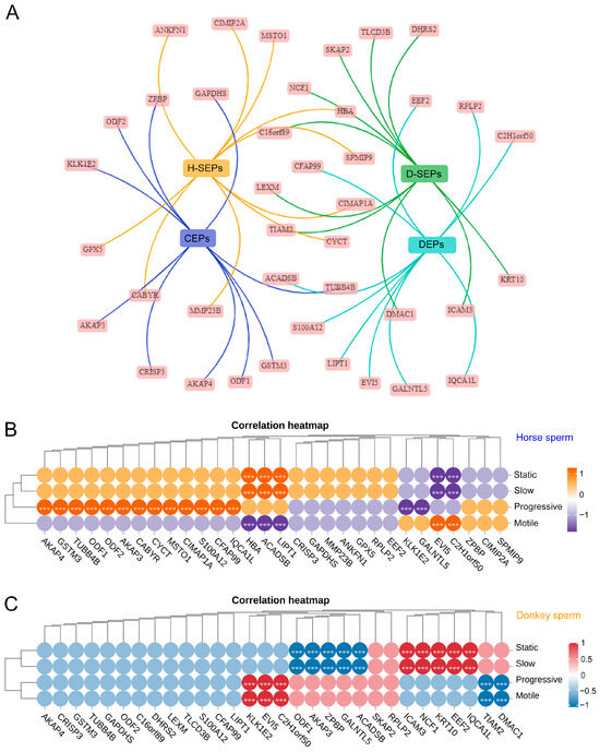 Correlation between horse and donkey sperm proteins and sperm viability. (A) The PPI network of horse and donkey sperm CEPs, SEPs, and DEPs. H-SEPs represent the SEPs of horse sperm. D-SEPs represent the SEPs of donkey sperm. (B) The correlation between horse sperm protein and sperm viability. The scale (1 to −1) indicates whether the correlation is positive (orange) or negative (purple). (C) The correlation between donkey sperm protein levels and sperm viability. The scale (1 to −1) indicates whether the correlation is positive (red) or negative (blue). *** indicates a statistically significant difference.