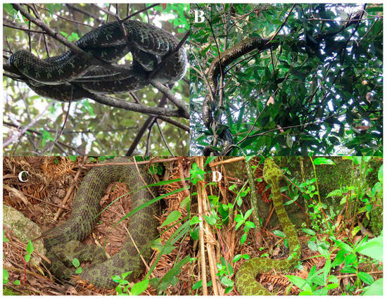 Behaviors of Mangshan pit vipers in their natural habitat; photographs by Bing Zhang. (A) Arboreal resting, (B) arboreal locomotion, (C) terrestrial resting, and (D) terrestrial locomotion.