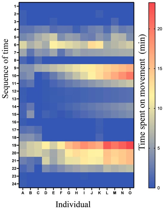All observations with continuous tracking times less than 24 h were excluded from the analysis, ensuring that only data from observations exceeding 24 h were utilized. Given that the official transition from summer to autumn, as designated by the National Meteorological Center, falls on August 7th at 14:53:48 with the start of autumn, it is difficult to categorize the data collected on that day as belonging solely to summer or autumn, since it encompasses less than 24 h of either season. Therefore, the data collected on that day were not included in our analysis either. From June 25th to September 3rd, observations were conducted on a total of 70 days. However, after careful analysis, only 37 days were retained as complete observations of the snakes.