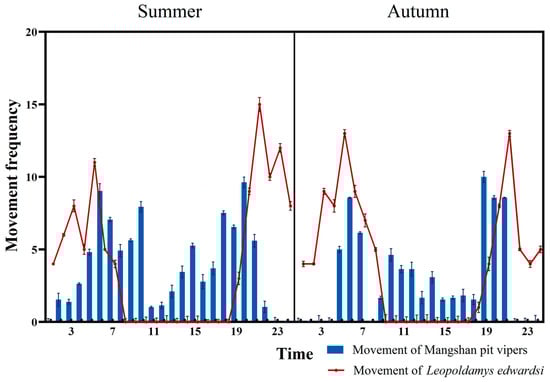 According to the overlap index calculations, the degree of overlap in activity time between the Mangshan pit viper and Leopoldamys edwardsi from 18:00 to 20:00 during both the summer and autumn seasons was moderate, with values of 0.85 (95% CI: 0.79–0.91) in summer and 0.83 (95% CI: 0.76–0.90) in autumn. This suggests a possible correlation between the snakes’ hunting behavior and the availability of their prey. Furthermore, the middle peak of movement activity coincided with the snakes’ basking periods (Figure 4), indicating a balanced schedule of foraging and thermoregulation.