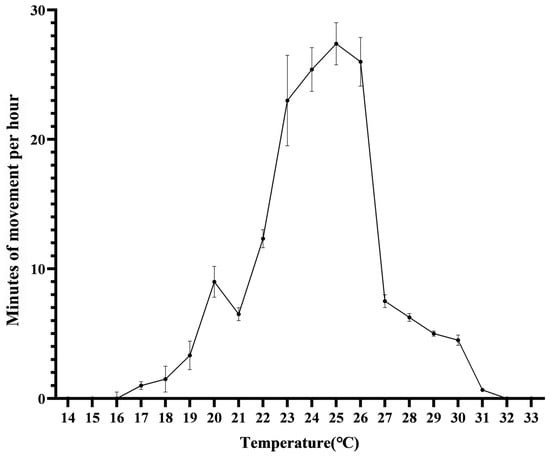 Relationship between ambient temperature and hourly movement counts of Mangshan pit vipers (mean ± SD).