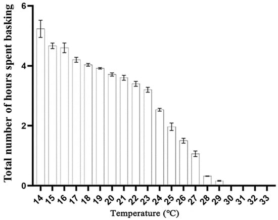 About the temperature effects on activity levels, we observed peak activity within an optimal temperature range of 22–26 °C, beyond which the snakes became inactive. Specifically, no movement was recorded when temperatures dipped below 16°C or soared above 31 °C (Figure 5). Notably, as temperatures escalated beyond 29–33 °C, the snakes abandoned their basking pursuits and sought refuge in the shade, highlighting their sensitivity to extreme heat. The duration of basking sessions was inversely proportional to the magnitude of temperature fluctuations, with the longest basking durations observed at moderate temperatures of around 14 °C, lasting approximately 5 h from 9:00 a.m. to 3:00 p.m. Conversely, basking became increasingly rare at temperatures exceeding 30 °C (Figure 6), further emphasizing the intricate balance between the snakes’ thermoregulatory needs and the challenges posed by varying environmental conditions.