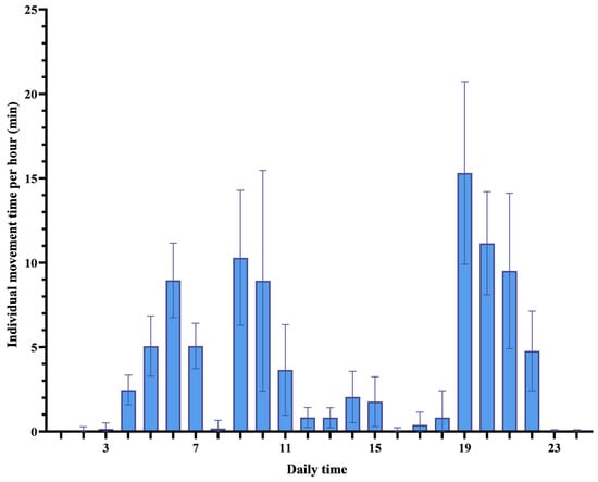 The diel activity rhythm of Mangshan pit vipers exhibited remarkable consistency, with resting (accounting for 83.45 ± 0.83% of their daytime behavior) and basking (comprising 7.31 ± 0.86%) predominating around the 9:00 a.m. to 11:00 a.m. timeframe. Our observations over 24 h periods revealed three distinct peaks of movement activity (3.78 ± 0.58%), occurring at 5:00 a.m.–7:00 a.m., 9:00 a.m.–11:00 a.m., and 17:00–19:00 (Figure 3). Notably, all individuals followed this consistent diel rhythm, displaying no significant variations in their activity patterns.