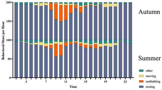 Furthermore, our observations during autumn reveal a subtle yet discernible shift in the snakes’ basking behavior. Mangshan pit vipers spent marginally more time basking in the warm autumnal sun compared to the summer months (Figure 7). This heightened propensity for basking, statistically significant at p < 0.05, underscores the strategic adaptation of these snakes to seasonal variations. In stark contrast to summer, when the snakes exhibited a diminished tendency to bask during peak sunlight hours (10:00 to 14:00), autumn witnessed a pronounced inclination towards sunny locales for thermoregulation (Figure 8). This seasonal shift highlights the snakes’ exquisite ability to optimize their basking behavior in response to changing environmental conditions.