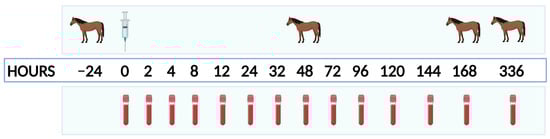 In addition to OST and TRH testing, resting blood samples for ACTH, insulin, glucose, cortisol, T3, T4, and free T4 (by dialysis—FT4d) were collected immediately prior to intra-articular injection (PRE), as well as at 2, 4, 8, 12, 24, 32, 48, 72, 96, 120, 144, 168, and 336 h post-injection (Figure 1). These samples were collected prior to being fed pelleted feed (above) and while they had access to hay and/or grass pasture. Any samples collected for ACTH, insulin, or glucose (daily, OST, or TRH) were collected into EDTA tubes and immediately placed on ice. Once glucose was tested using an equine-validated hand-held glucometer (AlfaTrack 3, Zoetis, Parsippany, NJ, USA) [16], EDTA blood tubes were centrifuged at 1000× g for 10 min, after which plasma was removed and immediately frozen at −20 °C. Samples for cortisol, T3, T4, and FT4d testing were collected into non-treated blood collection tubes and allowed to clot for 30+ minutes before centrifugation at 1000× g 10 min, followed by serum removal and storage at −20 °C. Once all treatment blocks were completed, samples were sent on dry ice to the Cornell University Endocrinology Research Testing Service for blinded analysis of ACTH, insulin, cortisol, T3, T4, and FT4d.