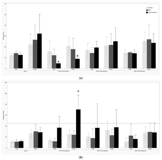 Treatment effects of intra-articular TA were present at 48 h post-injection in both the thyrotropin-releasing hormone and the oral sugar tests. These effects manifest as a decrease in both PRE and POST ACTH concentrations in the TRH test (Figure 2a) and an increase in POST insulin in the OST (Figure 2b). Intra-articular treatment with APS did not result in any significant differences for either test at any timepoint.