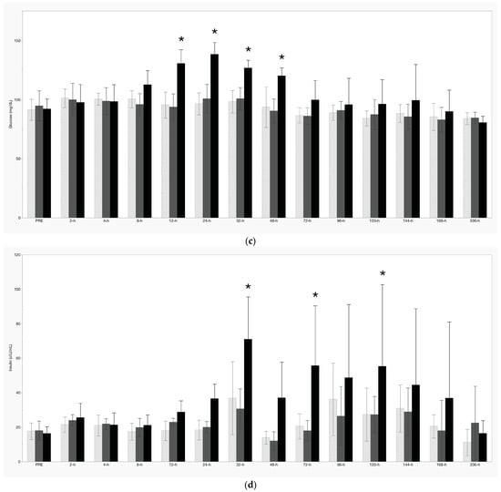 Resting concentrations of (a) adrenocorticotropin-releasing hormone (ACTH), (b) cortisol, (c) glucose, and (d) insulin. Values shown are mean +/− standard deviation. * denotes a significant treatment effect (p < 0.05).