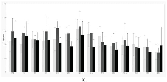 There was significant suppression of resting ACTH and serum cortisol concentrations following IA TA between 2 h and 24 h, as well as 48 h to 96 h (Figure 3a,b, respectively). Resting glucose increased significantly following TA treatment between 12 h and 48 h (Figure 3c), while insulin was increased at 32 h, 72 h, and 120 h post-IA TA (Figure 3d). There were no treatment effects noted with respect to T3, T4, or FT4d concentrations (Figure 4a–c). Additionally, there were no significant treatment effects of APS noted for any measured analyte.