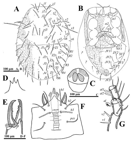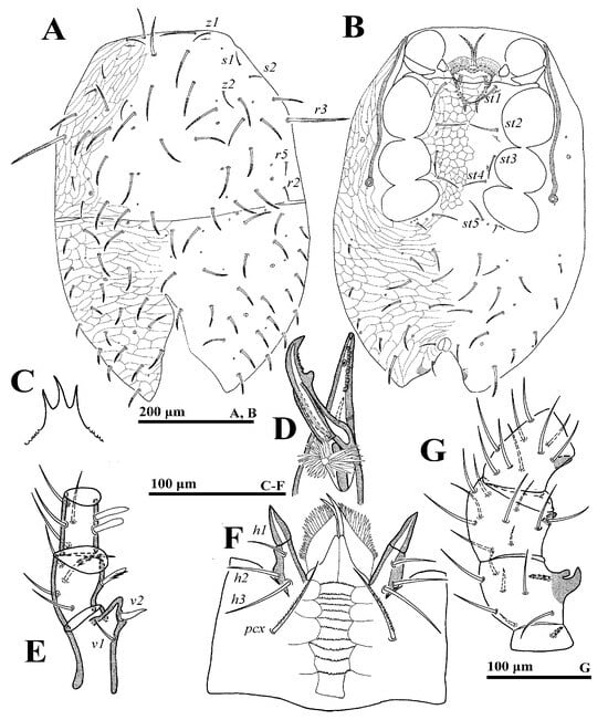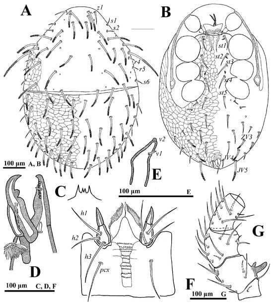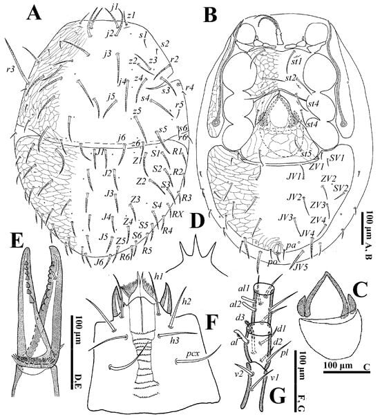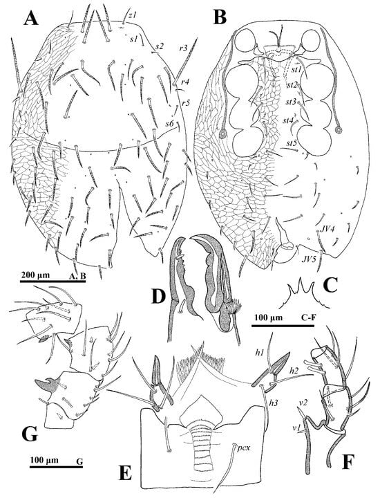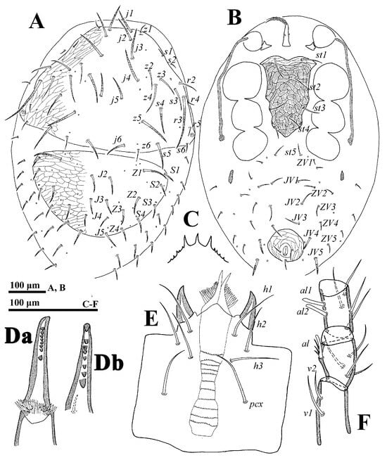 Gnathosoma (Figure 3C–F). Palp length: 255–291; trochanter bearing seta v2 evidently stouter and longer than v1. Movable digit with a blunt tooth. Lengths of setae h1–h3 and pcx on hypostome: h1 55–58, h2 65–68, h3 72–75 and pcx 67–71.