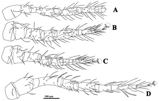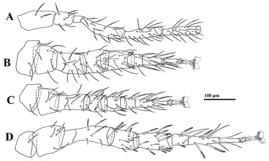 Cerogamasus tibetensis Jin & Yao sp. nov., deutonymph. (A)—Coxa–tibia of leg I. (B)—Leg II. (C)—Leg III. (D)—Leg IV.