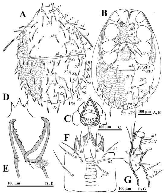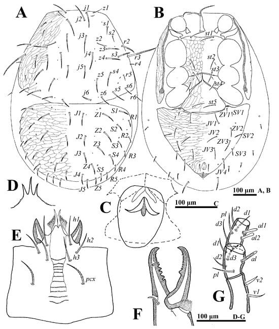 The system of idiosomal setal nomenclature followed []. Terminology for the palp chaetotaxy followed [], and then adenotaxy (idiosomal glands) and poroidotaxy (lyrifissures) followed [,]. The description of the males and deutonymphs omitted the features common with the females.