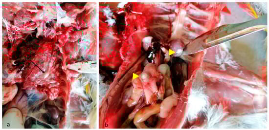 Macroscopic findings in parrot aspergillosis: (a) lungs showing fungal granulomas of various sizes (black arrows); (b) disseminated granulomas on spleen and intestinal serosa (yellow arrowheads).