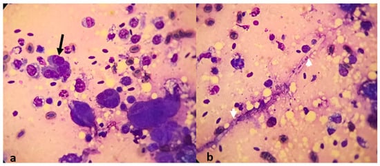 Furthermore, the cytological examination of the lung smears revealed the presence of inflammatory cells consisting of numerous neutrophiles, macrophages, and lymphocytes. Moreover, atypical cells showing multinucleated giant cells (Figure 3a) with intensely vacuolated cytoplasm and undifferentiated walls, along with few fungal hyphae, have been identified (Figure 3b).