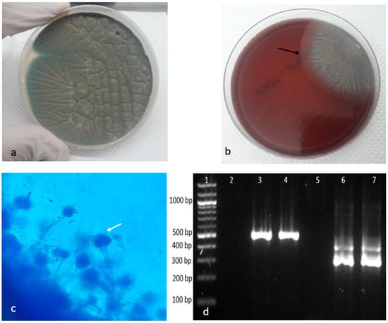 (a) Cultural characteristics of Aspergillus fumigatus colony: dense smoky and gray-green colonies on Sabouraud dextrose agar media; (b) cultural characteristics of Aspergillus fumigatus colony on Mueller–Hinton agar media showing gray-green colony (black arrow); (c) microscopical morphologies of Aspergillus fumigatus revealed by lactophenol cotton blue staining: typical columnar conidia heads (white arrow) showing characteristic form of vesicles under Lactophenol cotton blue staining, and ×20 magnification. (d) Molecular confirmation of genus Aspergillus and Aspergillus fumigatus: line 1: 1.2 kb molecular weight marker; lines 2 and 5 C-negative control; the product of 521 bp was amplified in line 3 (lung) and 4 (liver) samples by ASAP primers; using nested PCR, a product of 310 bp corresponding to Aspergillus fumigatus was obtained in the lung (line 6) and liver (line 7) samples using ASPU/AFI3 primers.