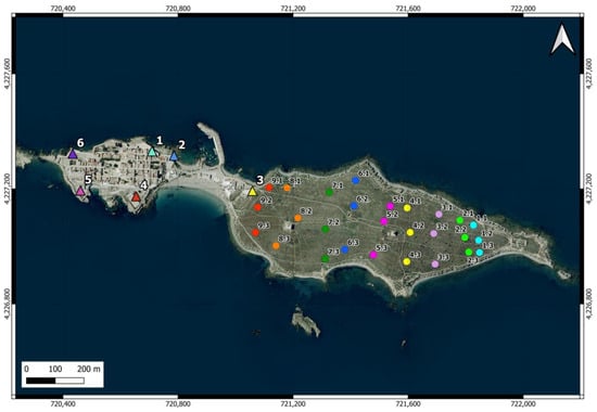 The island of Tabarca is the only inhabited island in the Valencian Community (Spain) and has a total area of approximately 40.2 hectares. It can be divided into two distinct areas: one located at the western end where the village is located (urban area covering 10.7 ha) and a larger area covered with scrubland and abandoned Opuntia crops of an extension of 29.5 (Figure 1). We have considered the urban area to include both the small village within the wall and the isthmus that connects the village with the shrubland area, as it includes various types of buildings (restaurants, official buildings, warehouses, and waste management facilities). Apart from birds, the island does not have abundant terrestrial fauna, but various species of arthropods, mollusks, and vertebrates can be observed []. The terrestrial flora is sparse due to the dry Mediterranean climate, strong winds, and high salinity. Although it lacks trees, it has various plant species, including the endemic Limonium furfuraceum, which is found only in the Valencian territory [,]. Some of the species of fauna and flora have some category of protection.