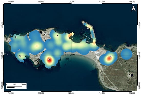 Heat map of the intensity of use of the urban area of Tabarca by cats. The numbers indicate the locations of official feeding points.