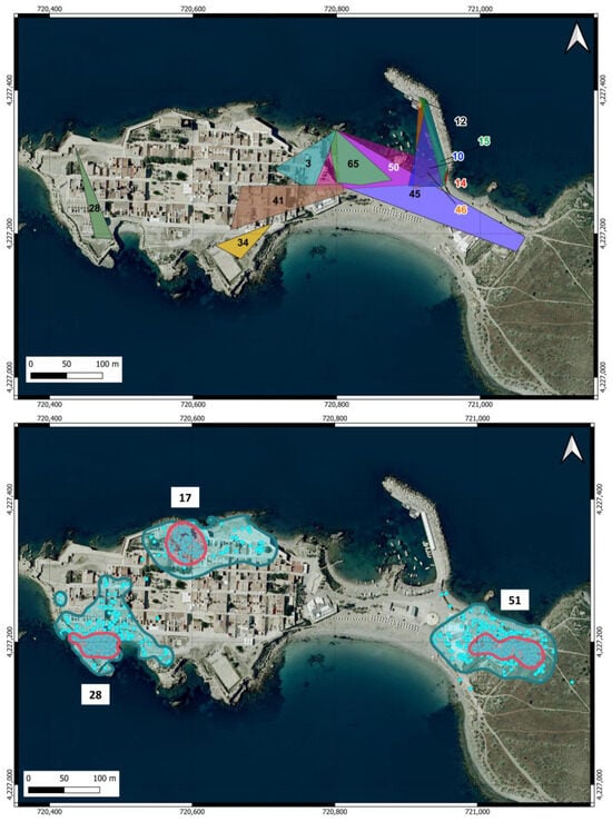 Home ranges of cats in the urban area of Tabarca estimated using two methods. Upper map: MCP calculated from records of cats with at least five locations obtained during the surveys. Lower map: The home range was estimated as KDE 95% (blue line), and core areas were estimated as KDE 50% (pink line) for the three neutered male cats equipped with GPS. The blue dots show the locations used for the calculations. The numbers in both maps indicate the cats listed in Table 1.