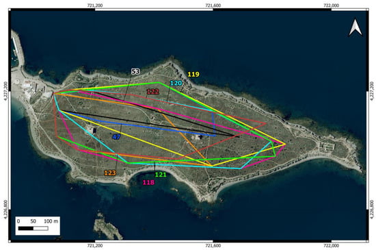 The home ranges of the eight individuals identified in the scrubland area were all larger than those estimated in the urban area, ranging from just under 3 ha to 13.9 ha (Table 2), with an average of 9.53 ha (SD = 3.65). The only female in this group was the individual with the largest home range. The individuals detected in the scrubland area covered nearly the entire available space up to the point on the island farthest from the urban area, and their home ranges overlapped extensively (Figure 5).
