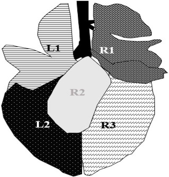 Segmentation of calves’ lungs in five examination areas. L1 = lobus cranialis sinister, L2 = lobus caudalis sinister, R1 = lobus cranialis dexter + lobus medialis dexter, R2 = lobus accessories (accessible in slaughter examination exclusively), R3 = lobus caudalis dexter [18,32].