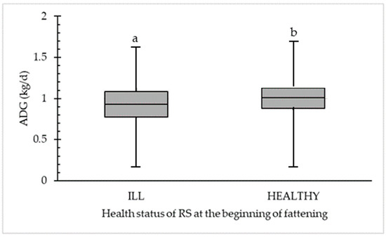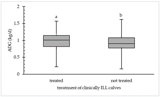 Difference in average daily weight gain (ADG in kg/d) in treated (n = 73) and not treated (n = 194) calves detected in clinically ILL calves at first physical examination at the beginning of fattening. Different letters (a,b) within the category (treated or not treated) are statistically different (p < 0.05).
