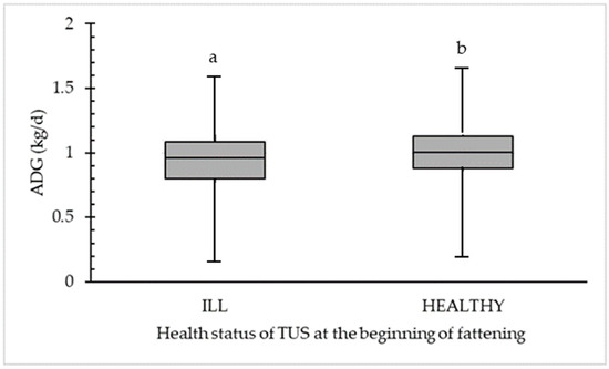 Significant difference in average daily weight gain (ADG in kg/d) between ultrasonographically ILL (n = 336) and HEALTHY (n = 264) calves detected in the first transthoracic ultrasonography scoring (TUS1) at the beginning of fattening. Different letters (a,b) within the category (ILL or HEALTHY) are statistically different (p < 0.05).