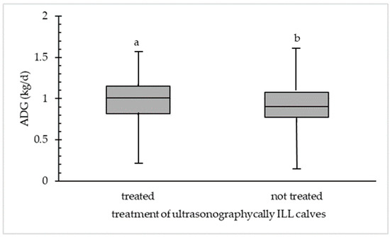 Difference in average daily weight gain (ADG in kg/d) between treated (n = 80) and not treated (n = 256) ultrasonographically ILL calves at first ultrasonographic examination at the beginning of fattening. Different letters (a,b) within the category (treated or not treated) are statistically different (p < 0.05).