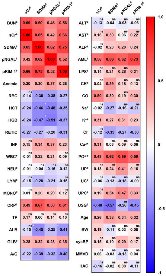 Correlation matrix between kidney biomarkers and clinicopathological indicators. The numbers in each cross box are r coefficients, indicating linearity. Red and blue correspond to positive and negative correlations, respectively. Hashes (#) indicate that the markers were analyzed after log2 transformation, as they showed a log-normal distribution. The black superscripted “ns” indicates that the correlation was not statistically significant; otherwise, the p-value was <0.05. A white superscripted asterisk (*) indicates a comparison with sCr; *, p < 0.05. Abbreviations: BUN, blood urea nitrogen; sCr, serum creatinine; SDMA, symmetric dimethylarginine; pNGAL, plasma neutrophil gelatinase-associated lipocalin; pKIM-1, plasma kidney injury molecule-1; RBC, red blood cell; HCT, hematocrit; HGB, hemoglobin; RETIC, reticulocyte count; INF, inflammation; WBC, white blood cell; NEU, neutrophil count; LYM, lymphocyte count; MONO, monocyte count; CRP, C-reactive protein; TP, total protein; ALB, albumin; GLB, globulin; A/G, albumin-to-globulin ratio; ALT, alanine aminotransferase; AST, aspartate aminotransferase; ALP, alkaline phosphatase; AML, amylase; LPS, lipase; CK, creatinine kinase; CO, calculated osmolality; UP, urine protein concentration; UC, urine creatinine concentration; UPC, urine protein-to-urine creatinine ratio; USG, urine-specific gravity; BW, body weight; sysBP, systolic blood pressure; MMVD, myxomatous mitral valve disease; HAC, hyperadrenocorticism.