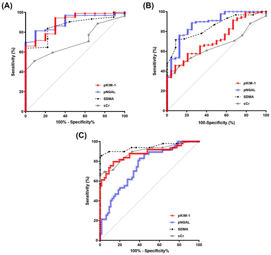 Accuracy of the biomarkers in detecting chronic kidney disease. (A) The control group was classified as the negative instance, whereas the risk and IRIS stage 1–4 groups were classified as positive instances. Overall, the areas under the curves of pNGAL and pKIM-1 were found to be comparable and were slightly higher than those of SDMA; sCr exhibited the lowest AUC. (B) The control and risk groups were classified as negative instances, whereas the IRIS stage 1–4 groups were classified as positive instances. Overall, the areas under the curves were highest in the order of pNGAL, symmetrical dimethylarginine (SDMA), pKIM-1, and serum creatinine (sCr). (C) The control, risk, and IRIS stage 1 groups were classified as negative instances, whereas the IRIS stage 2–4 groups were classified as positive instances. Overall, the areas under the curves of pKIM-1 were higher than those of pNGAL. Abbreviations: AUC, area under the curve; pNGAL, plasma neutrophil gelatinase-associated lipocalin; pKIM-1, plasma kidney injury molecule-1.